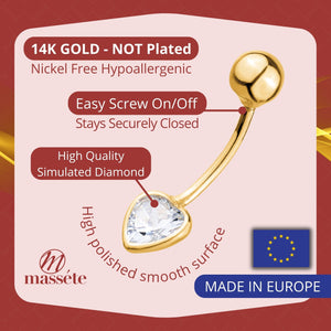 Elevate your body jewelry collection with Massete's exquisite 14k gold belly rings, adorned with sparkling heart-shaped gemstones. Experience the luxury and romance of a truly unforgettable piece that will make you shine with confidence.